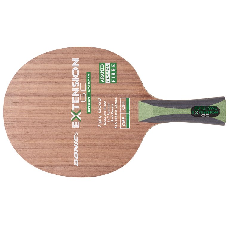 Between the controlled version AC and the OC, one of the fastest blades in our product range and recommended for uncompromising offensive players, the Extension Green Carbon is the perfect fit. Recommend for players who play an offensive game but also require the highest control. For players who are looking for a blade with high acceleration and impact, they now have a new alternative when choosing the DONIC Extension Green Carbon. The relatively hard outer veneer made of walnut offers in combination with the softer layers of Awan and Ayous create a very balanced blade. It has its name thanks to the green-black coloured carbon fibre which is a main component of its great touch on the ball.