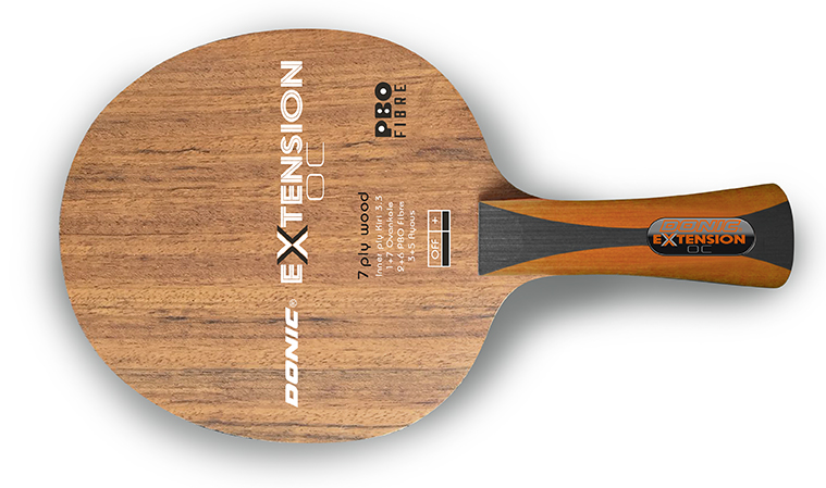 Extension OC is a very fast and relatively hard offensive blade. No compromise permitted. The Ovankole outerplies are extremely hard and in combination with the underlying PBO fibre/carbon layers create top acceleration. Ovankole is a fine African wood, used in the manufacture of guitars. A blade for the specialist, who wins points with powerful and quick strokes. One of the fastest from DONIC’s selection of blades.
