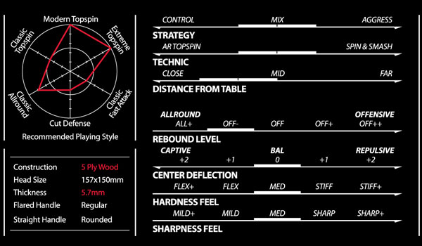 Ideal balance for pure pleasure of table tennis. Offensive blade of medium speed for all level of players.
