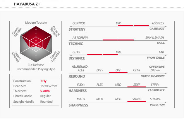 Harmonious synergy of wood and composite material. Zephylium not only improves the ball speed but defines the vibration better. Sharp and clear vibrations of Z blade upgrades the control phase of your game. Spin loading was also eased by new unique construction of layers. Wood-like flexibility of Z makes the ball contact feel very natural and solid. Well balanced power and top spin control of Z makes the player keep up with a longer continuous rally. New paradigm defines Hayabusa optimizing controversial properties to make the unprecedented table tennis weapon.