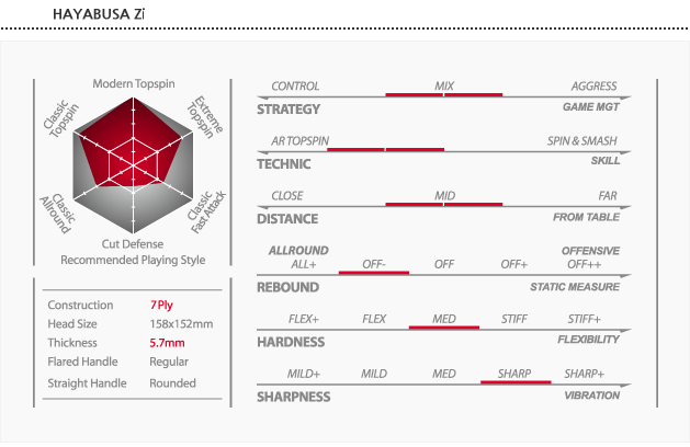 Creative synergy of wood and composite material. Zephylium in new construction makes Hayabusa Zi feel natural but sharper than all wood blades. Leveraged spin loading and increased ball energy (commonly noted as ‘heavy ball’) are made by the unique construction inside. Flexible but solid contact with the ball to generate heavy spins identifies Zi as the new European powerblade. New paradigm defines Hayabusa optimizing controversial properties to make the unprecedented table tennis weapon.