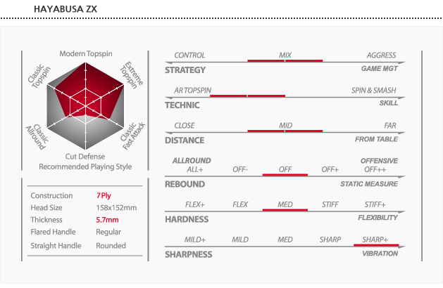 Powerful synergy of wood and composite material. Zephylium Carbon character in the second layer makes ZX feel sensibly sharp but unbelievably softer than other composite blades. Flexibility was kept by reconstruction of the inside layers, regardless the non-wood material. Player can make continuous top spins with extra power. Control phase of the game improves along with the winning opportunities. New paradigm defines Hayabusa optimizing controversial properties to make the unprecedented table tennis weapon. Made in Korea. In stock end of December 2012.