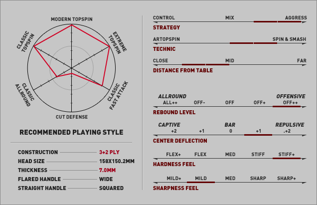 The basic construction of STRATO is based on that of our classic carbon blades such as SPEED OFF++ and POWER OFF+. But, replacement of older carbon with newly developed ENERGY CARBON realized another level of performance and feel. Improved efficiency of energy due to the lower damping of new material makes more powerful strokes. Further it gives improved control. KISO HINOKI of improved quality is used as top layers, and provides very comfortable and mild feel. This improvement gives STRATO the ability of all-round play though it is very fast blade. Topspin is more stable than players expect, and draws very sharp trajectory with good control. If a player can become accustom to the high speed, he/she will be able to perform every technique with ease.